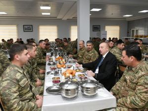 Prezident İlham Əliyev daha sonra yeməkxanada yaradılan şəraitlə maraqlandı, hərbi hissənin şəxsi heyəti ilə birlikdə nahar etdi.